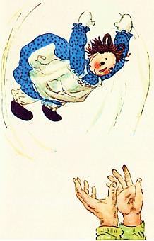 But the young painter twisted Raggedy Ann into funny attitudes and laughed and laughed as she looped about. Finally he got to tossing her up in the air and catching her. This was great fun for Raggedy and as she sailed up by the shelf the dolls all smiled at her, for it pleased them whenever Raggedy Ann was happy.