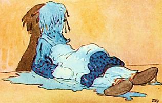 So Raggedy was placed back upon the shelf and the paint ran from her head and trickled down upon her dress.
