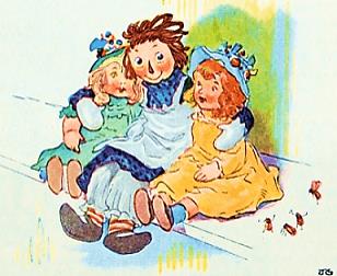 The young painter felt sorry and told her how it had happened. "If you will let me," he said, "I will take her home with me and will clean her up tonight and will bring her back day after tomorrow." So Raggedy was wrapped in a newspaper that evening and carried away.