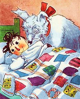 "It's the Fairies!" said Raggedy Ann. "To your basket quick, Fido! They are coming this way!" And Raggedy Ann ran back to her bed, with the bed clothes trailing behind her.