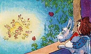 Raggedy Ann sat upright in bed. The room was flooded with a strange, beautiful light and the music came floating in through the nursery window. Raggedy Ann hopped from her bed and ran across the floor, trailing the bed clothes behind her. Fido followed close behind and together they looked out the window across the flower garden.