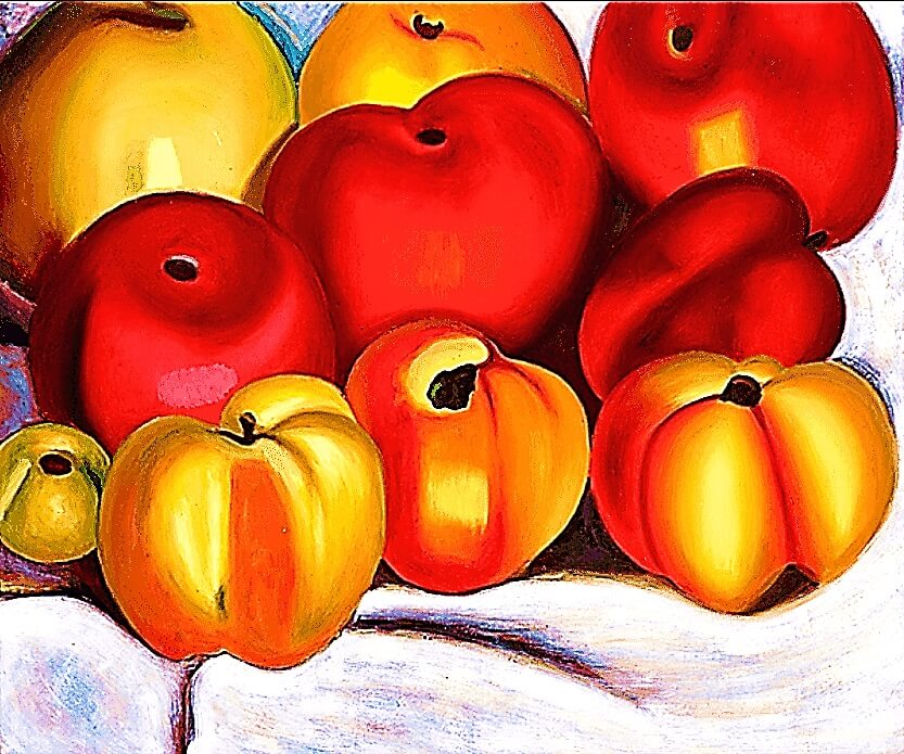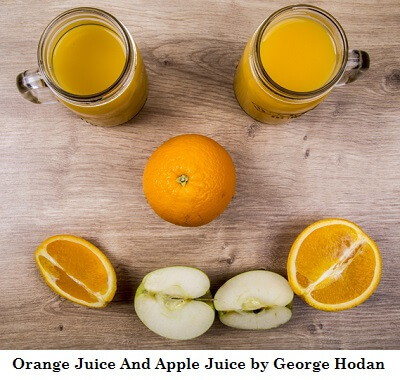 Draw your own still life from the photograph of apples, oranges, and orange juice below.