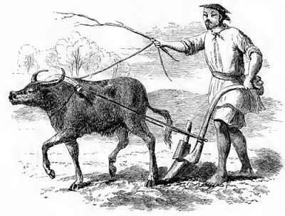 "We went outside the town, and found ourselves suddenly in the country. It was a complete change. Going through a gate in a wall took us from the streets to the fields, and going back through the gate took us to the streets again. We saw a man plowing with a plow that had only one handle, and made a furrow in the ground about as large as if he had dragged a pickaxe through it. The plow was pulled by a Chinese buffalo about as large as a two-year-old steer, and he was guided by means of a cord drawn through the cartilage of his nose. It was a poor outfit for a farmer, but the man who had it appeared perfectly contented, and did not once turn his eyes from his work to look at us.