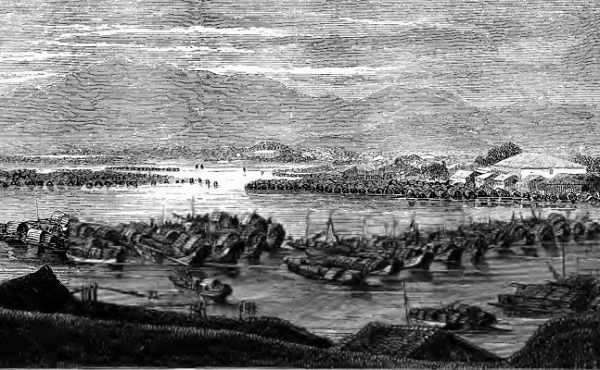 "The southern branch of the grand canal enters the river at Zhenjiang. The northern branch comes in some distance below. The river is plentifully dotted with junks, but this condition is not peculiar to the vicinity of the canal. All the way up from Shanghai to Wuhan it is the same, and sometimes twenty or thirty boats will be sailing so closely together as to endanger their cordage and sides. Perhaps you have seen New York Bay on a pleasant afternoon in summer when every boat that could hoist a sail was out for an airing? Well, imagine this great river for hundreds of miles dotted with sails as thickly as our bay on the occasion I have indicated, and you can have an idea of the native commerce of the Yangtze. Nobody knows how many boats there are on the river, as no census of them is taken. The mandarins collect toll at the river stations, but do not trouble themselves to keep a record of the numbers. I asked a Chinese merchant who is a fellow passenger with us how many boats there are engaged in the navigation of the Yangtze and its tributaries, and he answers,