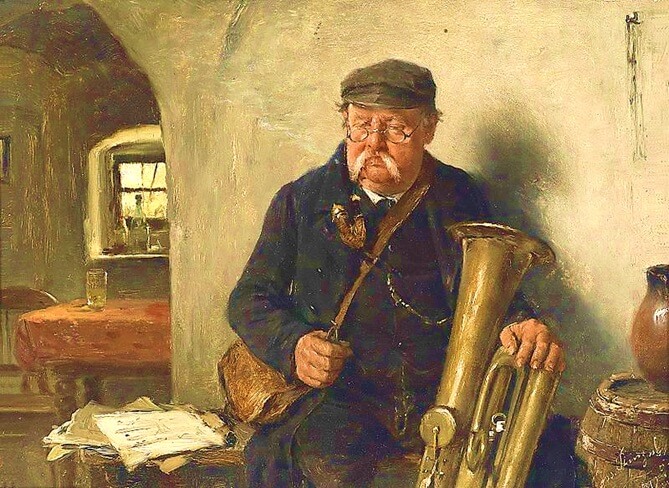 Study the lesson image, 'Der Tubaspieler (The Tuba Player),' by Josef Kinzel, and find the following: