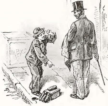5. With the dollar he bought a box, three brushes, and some blacking. He then went to the corner of the street, and said to every one whose boots did not look nice, 'Black your boots, sir, please?'