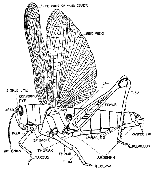 There were many different families of Grasshoppers, but they were all related. Some had short horns, or feelers, and red legs; and some had long horns. Some lived in the lower part of the meadow where it was damp, and some in the upper part. The Katydids, who really belong to this family, you know, stayed in trees and did not often sing in the daytime. Then there were the great Road Grasshoppers who lived only in places where the ground was bare and dusty, and whom you could hardly see unless they were flying. When they lay in the dust their wide wings were hidden and they showed only that part of their bodies which was dust-color. Let the farmer drive along, however, and they rose into the air with a gentle, whirring sound and fluttered to a safe place. Then one could see them plainly, for their large under wings were black with yellow edges.