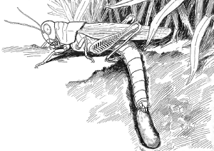 Perhaps those Grasshoppers who were best known in the meadow were the Clouded Grasshoppers, large dirty-brown ones with dark spots, who seemed to be everywhere during the autumn. The fathers and brothers in this family always crackled their wings loudly when they flew anywhere, so one could never forget that they were around.